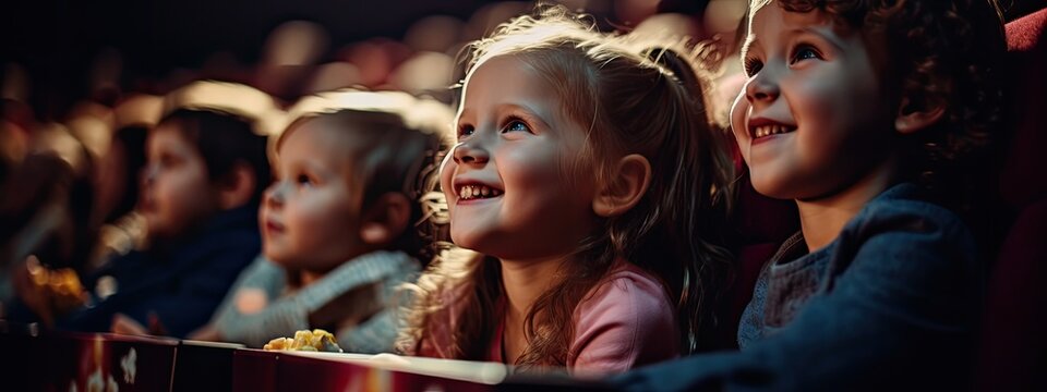 uśmiechnięte dzieci siedzące w kinie na fotelach z wielkimi uśmiechami i wielką radością