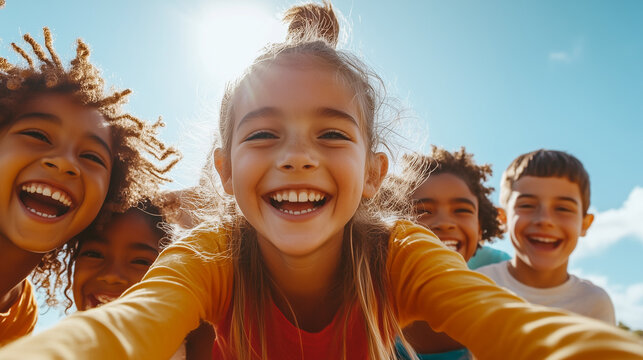 Grupa młodych dzieci stoi obok siebie, uśmiechając się i wyglądając na zadowolonych. Są ubrani w różne kolorowe ubrania i trzymają się za ręce. Dzieci są wesołe i pełne energii