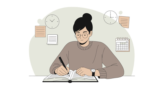 Diligent Female Student Studies With Notebook And Exam Preparation For Test