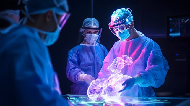 A virtual hologram simulation showcasing the intricate process of cancer surgery and the subsequent recovery stages highlighting the advancements in medical technology and the future of healthcare