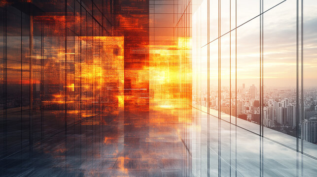futuristic open door illuminated by vibrant neon gold, silver, and white lights symbolizes new opportunities and innovation. The digital technology backdrop represents the convergence of reality and i