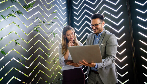 Client, tablet and discussion with business people in office for negotiation, feedback and planning. Advisor, consulting and proposal with employee in agency for contract policy, review and project