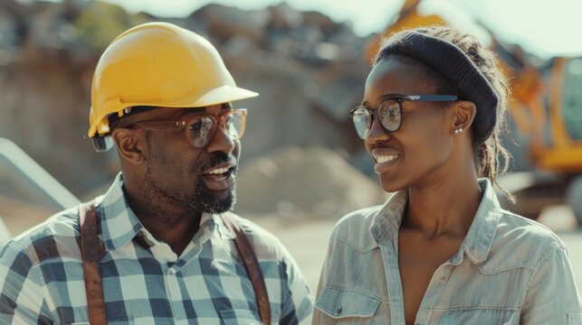 Confident black architect discussing project details with colleague at construction site, both wearing safety helmets and glasses, engaging in productive conversation.