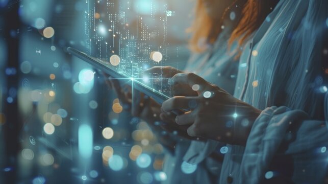 Professional reviewing digital documents on a futuristic interface, streamlining workflow for efficient data management and business strategy.