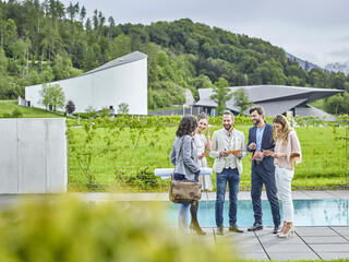 Smiling colleagues standing outside talking