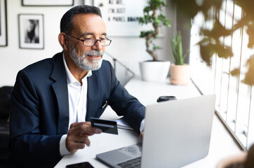Cheerful mature european man in suit works at laptop, uses credit card for investment startup in modern office