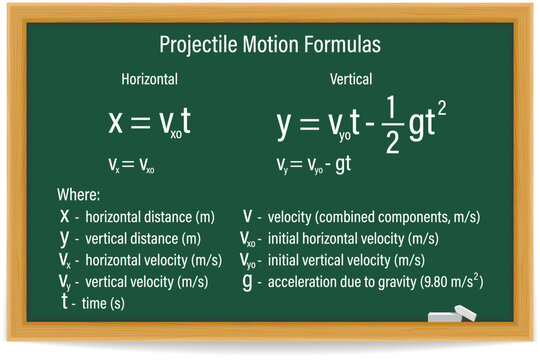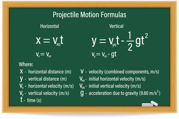 Projectile Motion Formulas on a green chalkboard. Education. Science. Formula. Vector illustration.