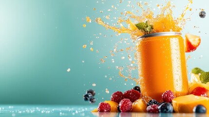 A refreshing splash of fruit juice erupts from a can, highlighting the vibrant colors and energy of a delicious summer drink, promising a burst of flavor.