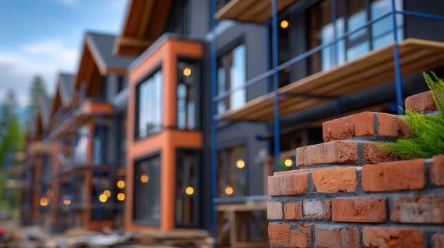 Modern multi-story buildings under construction with brick wall and scaffolding