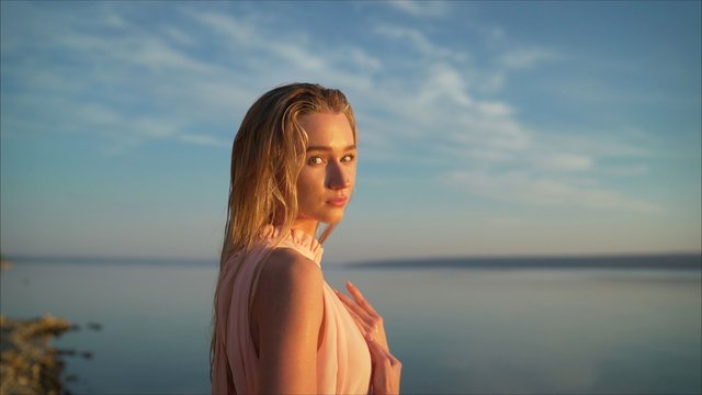 Young free girl in the morning on a background of water.. A beautiful girl raised her hand to pray. And promised myself. And the sun goes down. God bless you for the good.