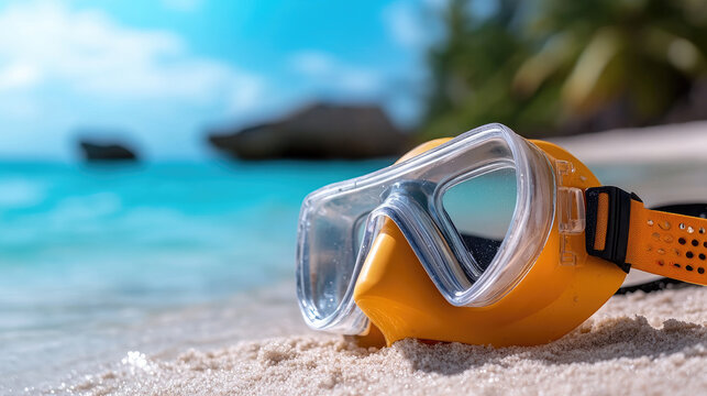 Man in yellow goggles swimming in blue water. Summer activities and water sports advertising