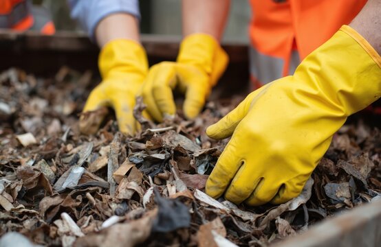 Workers in yellow gloves sort through construction debris, focusing on waste management, environmental responsibility. Teamwork in safety gear promotes efficient recycling, site cleanup for