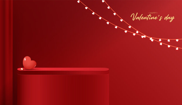 Red podium display background products for valentine’s day in love platform. stand to show cosmetic with craft style. symbols of love for happy. vector design