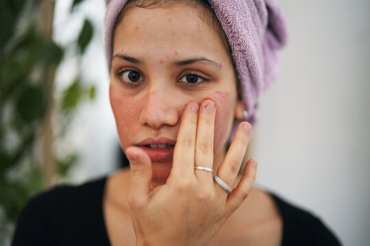 A young woman with a towel on her head applies a reddish face mask to her skin. She is focused on her skincare routine, promoting healthy skin and self-care.