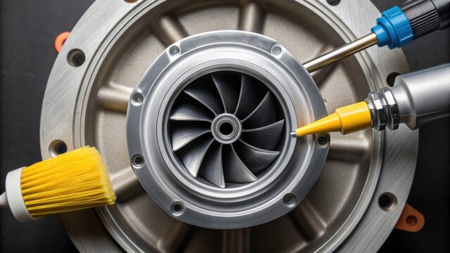 A close-up of a turbocharger showing its turbine, with tools and brushes for maintenance.