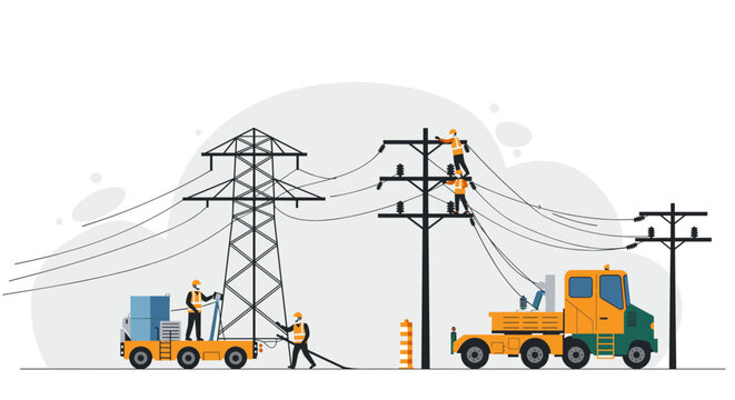 Construction crew working on power lines maintenance and repair with safety equipment