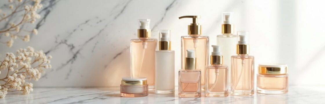 Collection of elegant glass cosmetic bottles on white marble background. Luxury skincare products in various shapes, gold caps. Stylish display, beauty salon promo concept. Floral decoration in