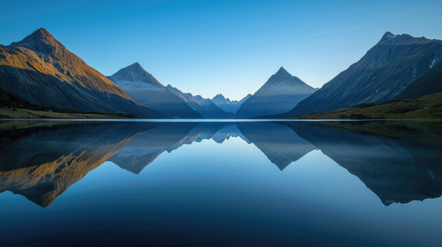 Reflection of majestic mountains on a calm lake in the morning under a blue sky