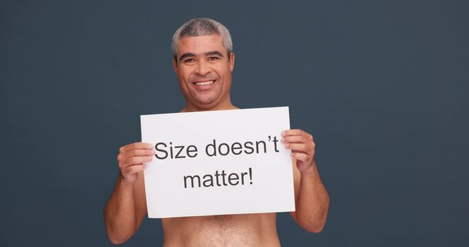 Happy, self love and pride with man and poster in studio for wellness, confidence and acceptance. Health, body positivity and message with portrait of person on dark background for empowerment