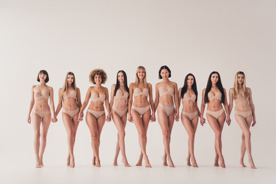 Full length photo of adorable excited women wear lingerie no retouch skin body positive empty space isolated pastel beige color background