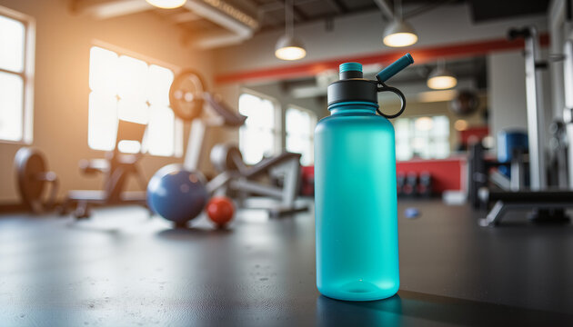 Vibrant reusable water bottle on gym floor, promoting hydration