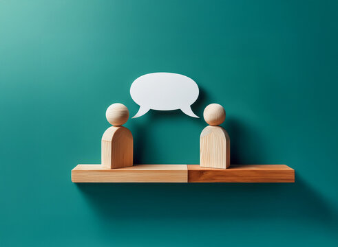 Two wooden figures engage in conversation, represented by a blank speech bubble, symbolizing communication and dialogue.  The scene is minimalist, promoting contemplation of interpersonal interaction.
