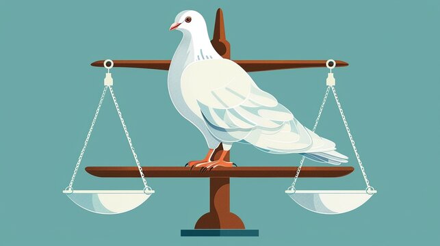 White dove sitting on scales background image. protecting world peace with laws 2d illustration wallpaper picture backdrop. Conflict concept for business presentation corporate