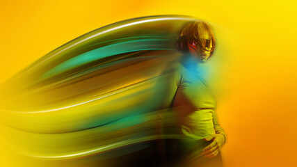 Young woman holds metal water bottle against colorful urban graffiti background, promoting sustainability and hydration