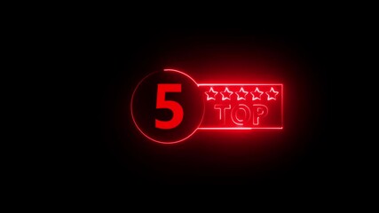 Glowing neon top 5 star rating icon animation on dark background. Top 5 star customer product rating review icon. Symbol, advertising badge,ranking, review, rating, or awards.