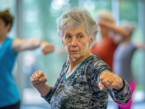 Senior woman practicing martial arts in a fitness class, showing strength, focus, and determination; perfect concept for promoting active aging, wellness, and community fitness programs.