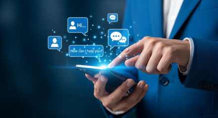 Contact us and virtual customer service. A person touch on virtual screen with modern contact icons, including chatbot, message, email, and call options, representing business support solutions.