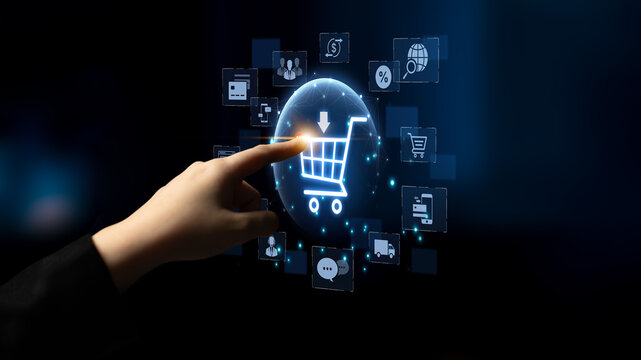 Concept of e-commerce and online shopping technology. A digital marketplace with a customer shopping cart, payment options, and worldwide delivery for a complete retail experience. Fermion