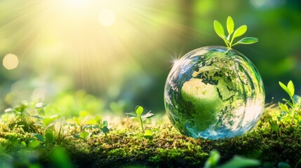Hand holding lightbulb with Earth inside and green grass symbolizing renewable energy and sustainable environment with eco icons promoting environmental awareness