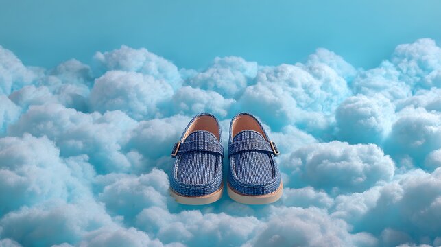 A pair of shoes walking on a cloud represents dreams and freedom.