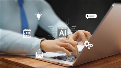 Businessman using AI assistant, boost productivity, schedule planning, smart automation, AI technology, protect privacy, automated emails and business support concept. 4K 3D video animation