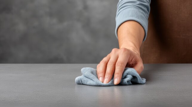 Detailed shot of person diligently cleaning table surface with cloth promoting hygiene and maintaining spotless indoor environment.