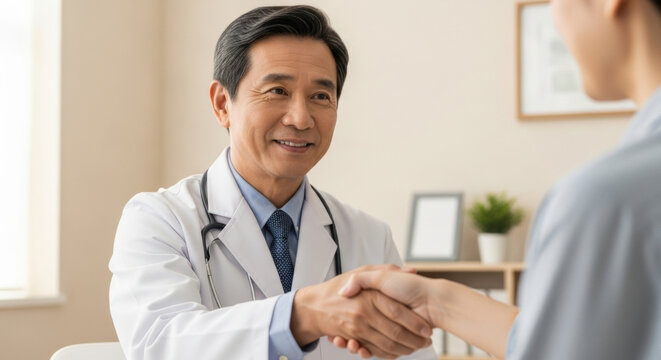 Confident male doctor greets patient with warm handshake in modern medical office, promoting trust and professionalism in healthcare consultation setting