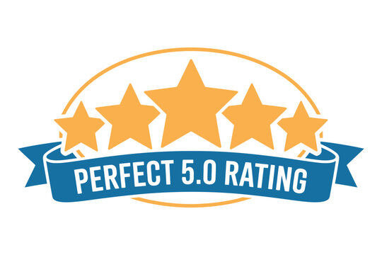 A graphic design of a perfect 5.0 rating with five yellow stars and a blue banner on a white background