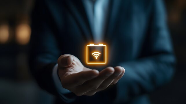 Businessman Holding Digital Battery Icon with Wi-Fi Signal in Air