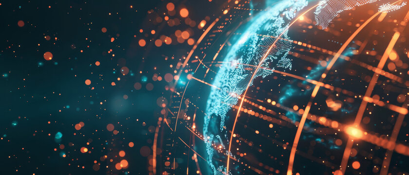 Abstract digital network with Earth globe and radiant lines, technology theme, , real photo, photography