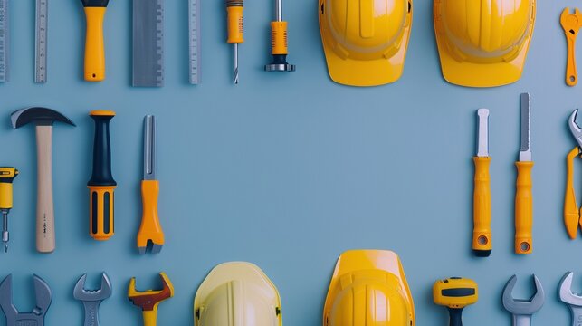 Flat lay of construction tools and hard hats banner background copy space, ai generated