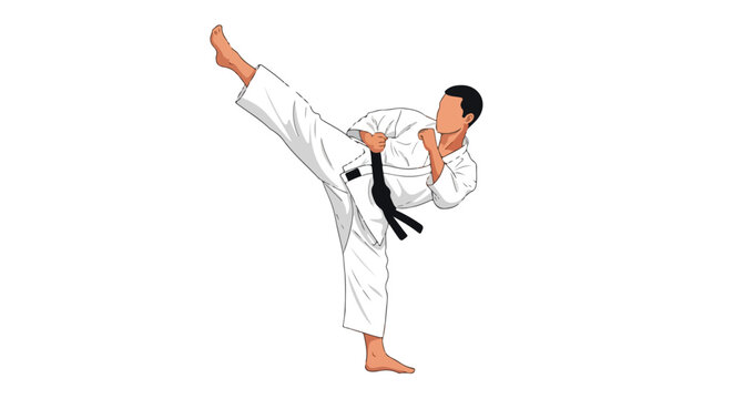 Illustration depicting an athletic male engaged in a dynamic karate side kick against a stark white backdrop promoting martial arts