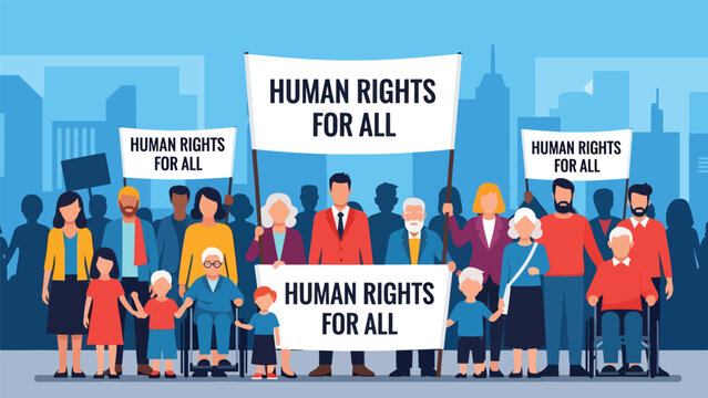Vector art of a diverse community peacefully marching for equality, holding signs supporting universal human rights, promoting social justice and inclusion in an urban public setting