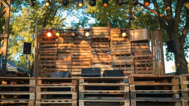 An outdoor concert venue with a stage constructed entirely from wooden pallets. The stage is powered by biogas powering the lights and sound for the performance while also promoting .