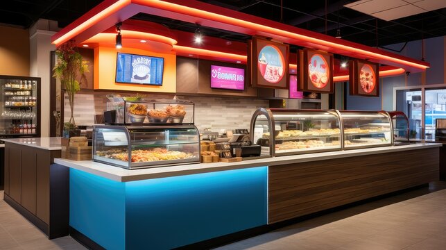 Festive caf counter adorned with garlands and red bows displaying a variety of holiday pastries and drinks with an open area in the background available for text overlay or additional design elements
