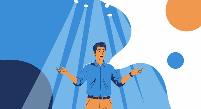 A cheerful man in an orange jacket waves and points to a blank sign against a vibrant pop art background.