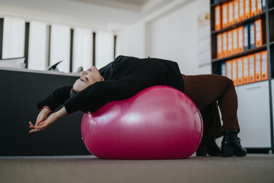 A professional individual reclining on a pink exercise ball in a modern office setting, promoting the concept of workplace wellness and the importance of balancing productivity with healthy habits.