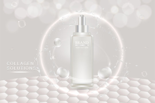 Beauty product ad design, white cosmetic container with collagen solution advertising background ready to use, luxury skin care banner, illustration vector.