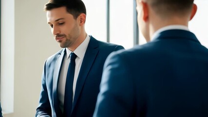Confident businessman receives congratulations and a bonus envelope in a sunlit modern office, 4k high quality