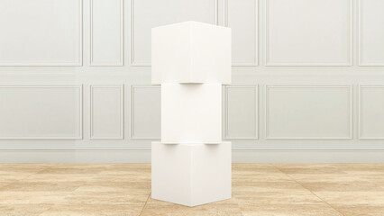 Blank plane cube stack in hotel lobby or pre-function area for event branding. 3D rendering of cube stack mockup for branding indoor or outdoor. For Exhibition and promotional activities.